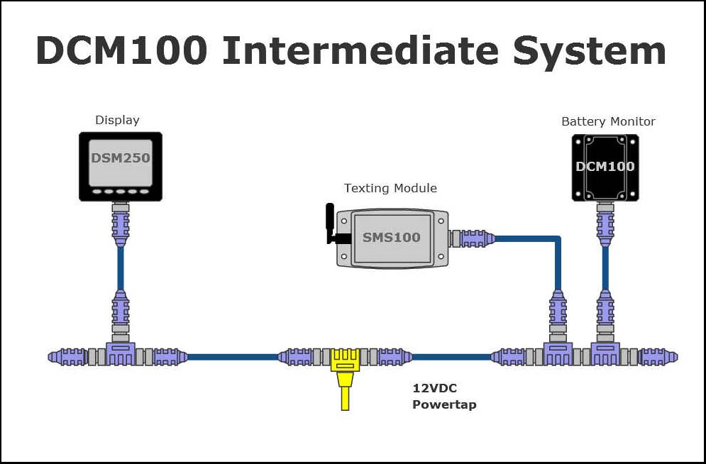 Maretron’s Direct Current Monitor (DCM100) provides information about the DC electrical system and in this example the DCM100 is used to monitor the house battery bank. Vital battery information including voltage, current, state of charge, and battery temperature are provided. If the battery voltage drops to an unacceptable level, the display (DSM250) can detect the problem and instruct the text module (SMS100) to send a text message.