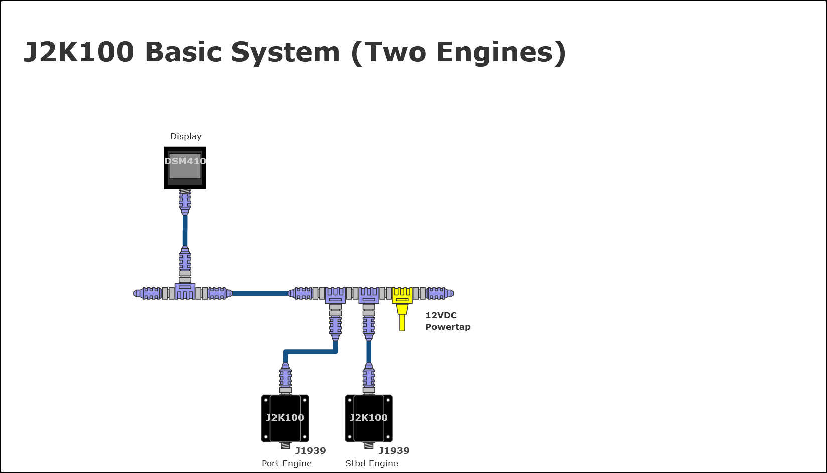 | J2K100 | Port Engine | Monitors RPM, boost and oil pressure, oil and coolant temp, voltage, fuel rate, hours, and more depending on the particular engine |