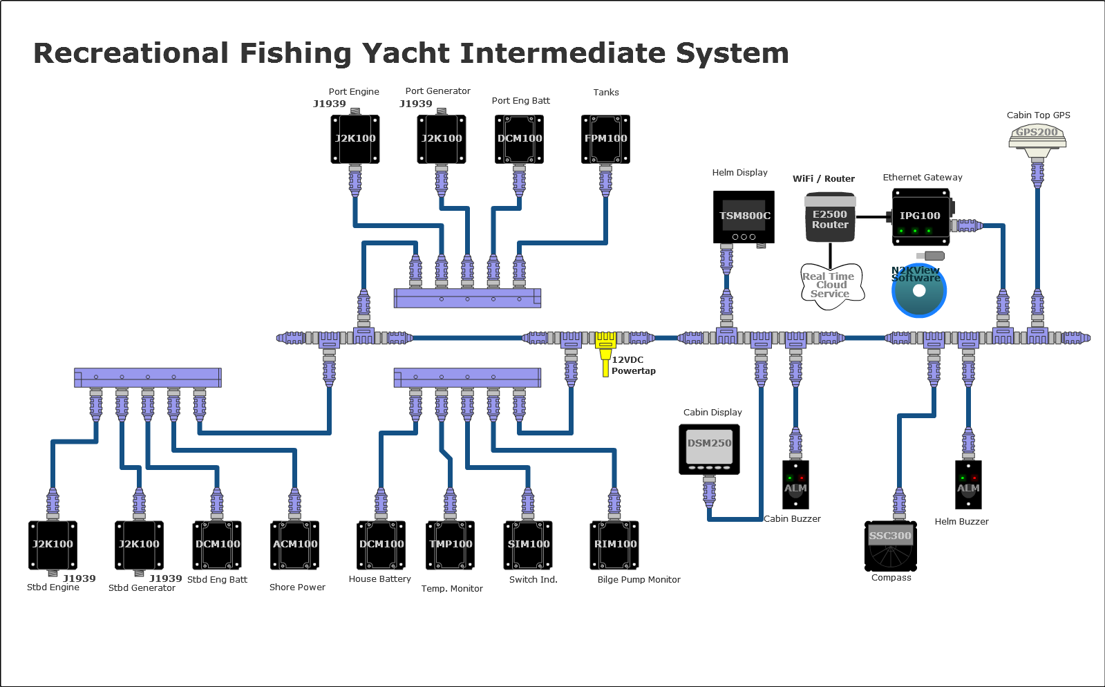 This Recreational Fishing Yacht intermediate monitoring system will monitor two propulsion engines and their starter batteries, two generators, shore power, 4 tanks, the house battery bank, 5 different temperatures around the boat, 3 bilge compartments, and GPS data including position, SOG, and COG. Information is displayed at the helm using a 8” touchscreen and from the owner’s cabin using a 5.7” display. Alarms are programmable and sounded at the helm and owners cabin via the annunciators or buzzers. The WiFi / router allows data to be displayed onboard through a PC, smartphone or tablet device and with an Internet connection, the data can be viewed remotely.