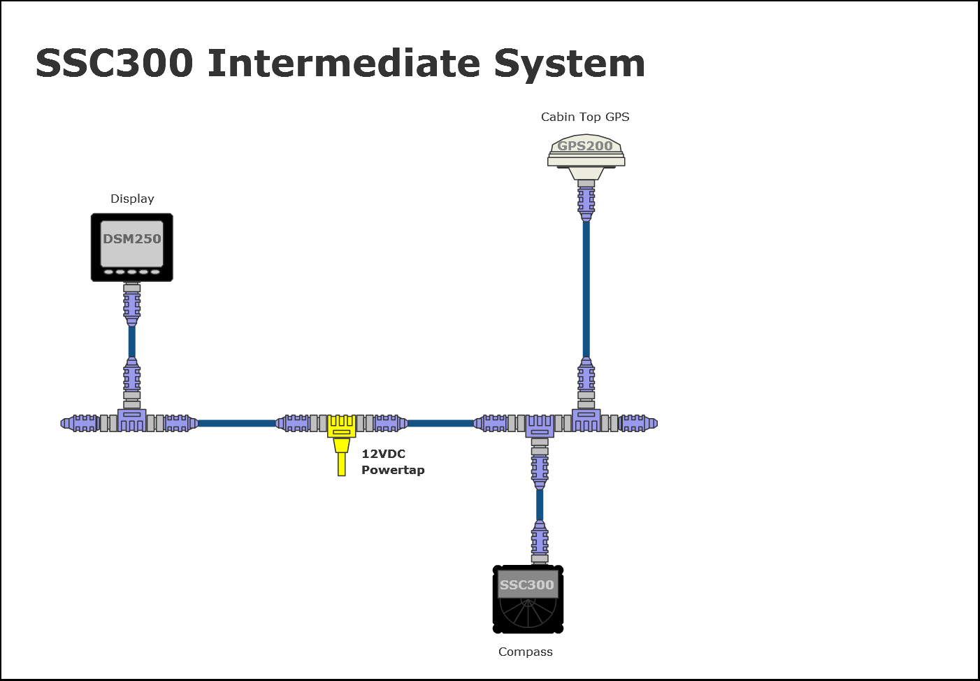 The intermediate compass system includes Maretron’s solid state compass (SSC300), which provides magnetic heading information. This system also includes a GPS antenna/receiver (GPS200) which provides magnetic variation based on the vessel’s position. The magnetic variation is combined with the magnetic heading within the display to provide the user with true heading.