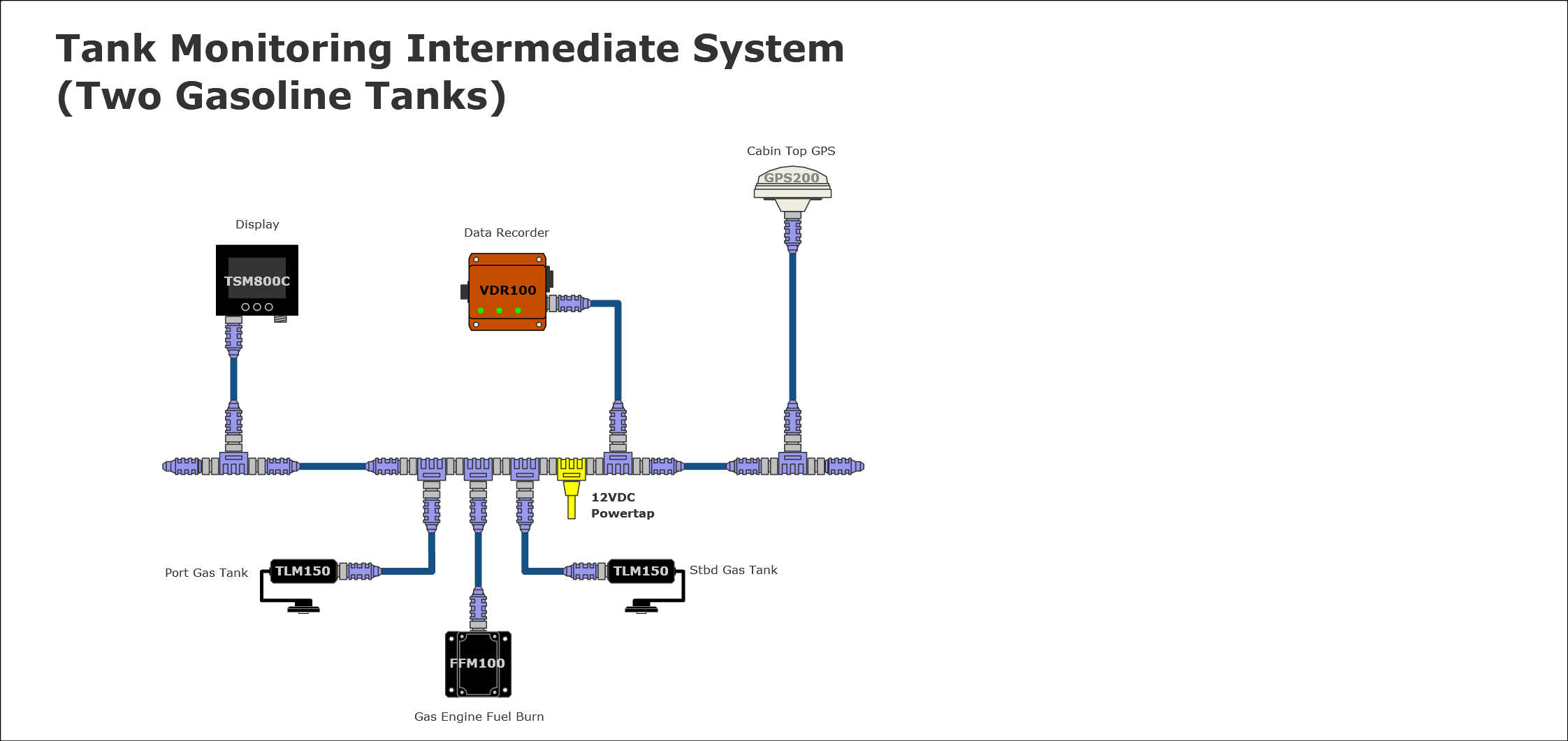The intermediate tank monitoring system for a dual gasoline/petrol engines and two fuel tanks uses fuel rate information from the fuel flow monitor (FFM100) combined with the vessels speed from the GPS antenna/receiver (GPS200) to provide fuel economy information (e.g., miles/gallon or kilometers/liter). In addition, tank monitors provide remaining fuel information so the display can compute distance and time to empty. The TLM150 senses the level of the fluid in the tank using ultrasonic technology eliminiating the need for probes into the tank, which often foul or corrode.